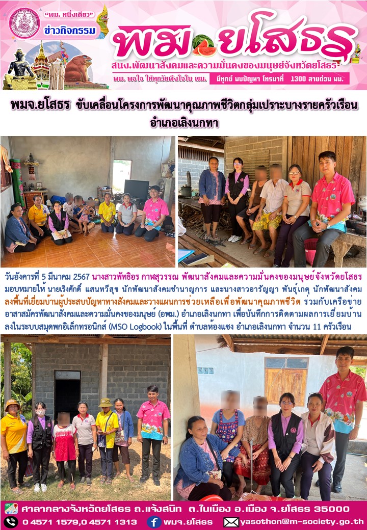 พมจ.ยโสธร ขับเคลื่อนโครงการพัฒนาคุณภาพชีวิตกลุ่มเปราะบางรายครัวเรือน อำเภอเลิงนกทา (5 มีนาคม 2567)