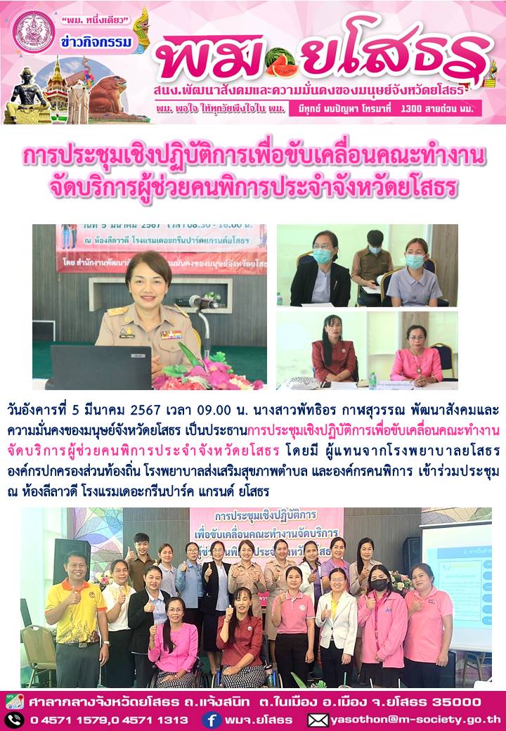 ประชุมเชิงปฏิบัติการเพื่อขับเคลื่อนคณะทำงานจัดบริการผู้ช่วยคนพิการประจำจังหวัดยโสธร (5 มีนาคม 2567)