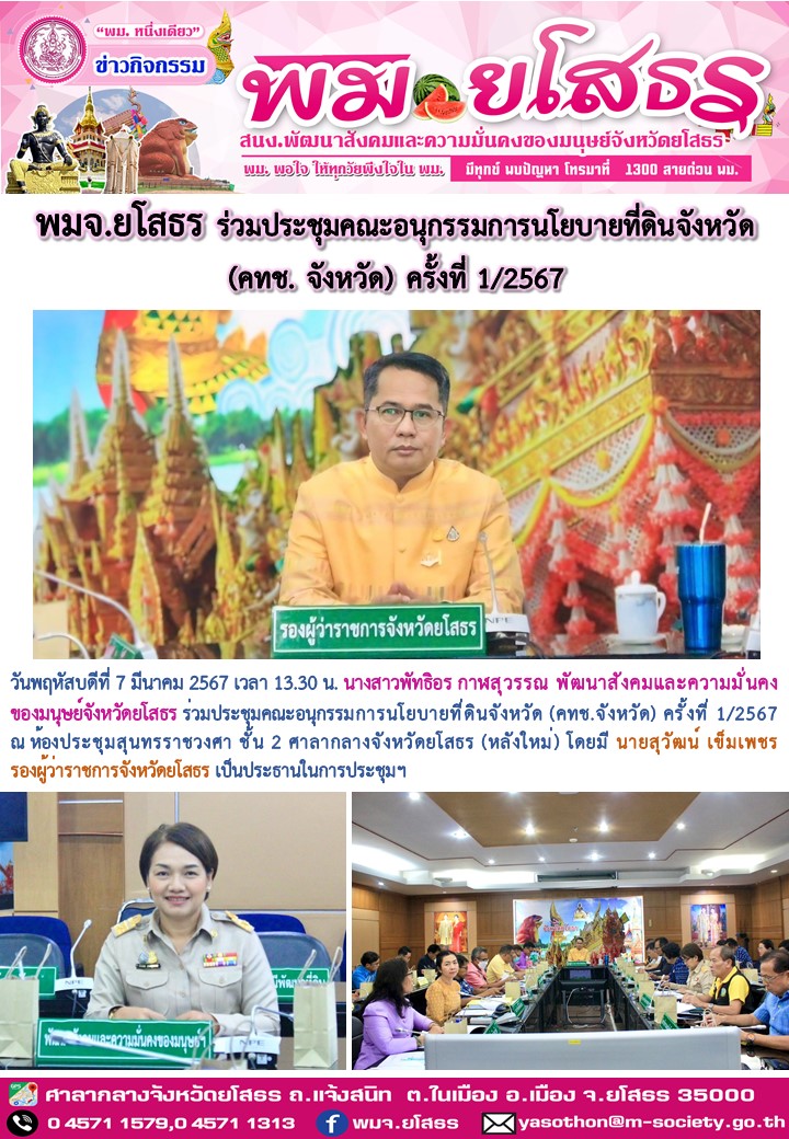 วันที่ 30 เม.ย. 2567 (14:39 น.)วันพฤหัสบดีที่ 7 มีนาคม 2567 เวลา 13.30 น. นางสาวพัทธิอร กาฬสุวรรณ พัฒนาสังคมและความมั่นคงของมนุษย์จังหวัดยโสธร ร่วมประชุมคณะอนุกรรมการนโยบายที่ดินจังหวัด (คทช.จังหวัด) ครั้งที่ 1/2567 ณ ห้องประชุมสุนทรราชวงศา ชั้น 2 ศาลากลางจังหวัดยโสธร (หลังใหม่) โดยมี นายสุวัฒน์ เข็มเพชร รองผู้ว่าราชการจังหวัดยโสธร เป็นประธานในการประชุมฯ