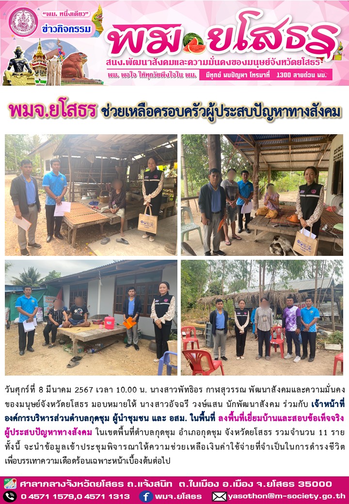 พมจ.ยโสธร ลงพื้นที่เยี่ยมบ้านและสอบข้อเท็จจริง ผู้ประสบปัญหาทางสังคม ( 8 มีนาคม 2567)