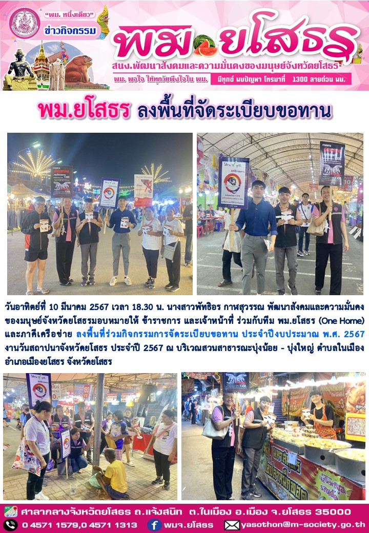 พม.ยโสธร ลงพื้นที่ร่วมกิจกรรมการจัดระเบียบขอทาน ประจำปีงบประมาณ พ.ศ. 2567 งานวันสถาปนาจังหวัดยโสธร ประจำปี 2567 (10 มีนาคม 2567)