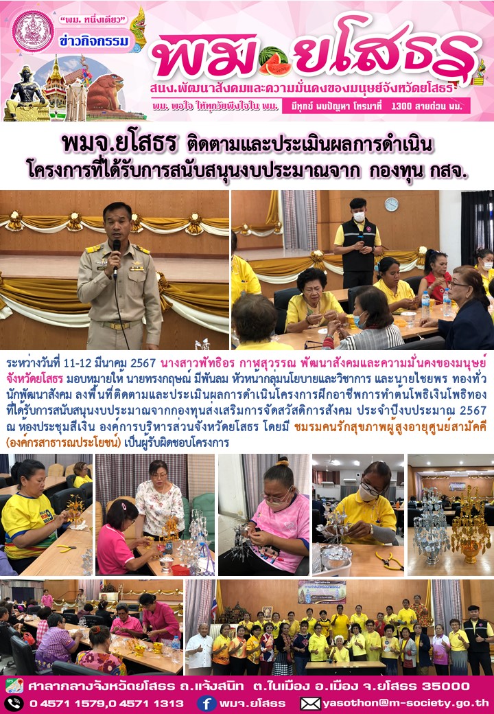 วันที่ 30 เม.ย. 2567 (15:36 น.)ระหว่างวันที่ 11-12 มีนาคม 2567 นางสาวพัทธิอร กาฬสุวรรณ พัฒนาสังคมและความมั่นคงของมนุษย์จังหวัดยโสธร มอบหมายให้ นายทรงกฤษณ์ มีพันลม หัวหน้ากลุ่มนโยบายและวิชาการ และนายไชยพร ทองทั่ว นักพัฒนาสังคม ลงพื้นที่ติดตามและประเมินผลการดำเนินโครงการฝึกอาชีพการทำต้นโพธิเงินโพธิทองที่ได้รับการสนับสนุนงบประมาณจากกองทุนส่งเสริมการจัดสวัสดิการสังคม ประจำปีงบประมาณ 2567 ณ ห้องประชุมสีเงิน องค์การบริหารส่วนจังหวัดยโสธร โดยมี ชมรมคนรักสุขภาพผู้สูงอายุศูนย์สามัคคี (องค์กรสาธารณประโยชน์) เป็นผู้รับผิดชอบโครงการ