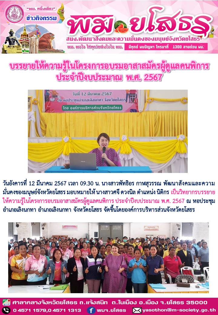 พม.ยโสธร เป็นวิทยากรบรรยายให้ความรู้ในโครงการอบรมอาสาสมัครผู้ดูแลคนพิการ ประจำปีงบประมาณ พ.ศ. 2567 (12 มีนาคม 2567)
