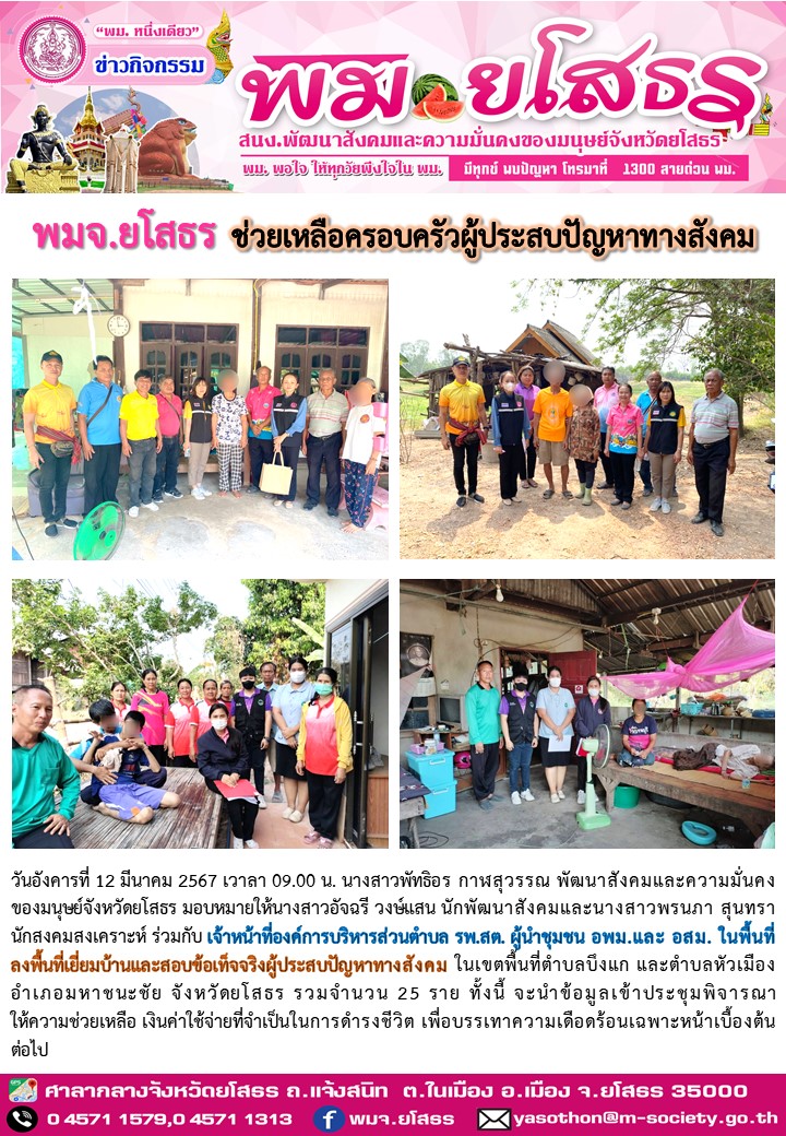 พม.ยโสธร ช่วยเหลือครอบครัวผู้ประสบปัญหาทางสังคม 2567 (12 มีนาคม 2567)