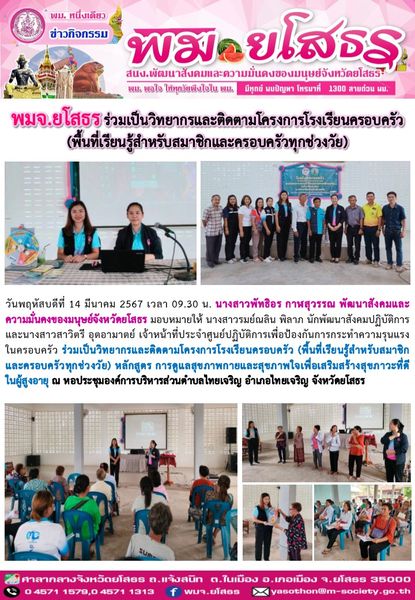 พมจ.ยโสธร ร่วมเป็นวิทยากรและติดตามโครงการโรงเรียนครอบครัว (พื้นที่เรียนรู้สำหรับสมาชิก และครอบครัวทุกช่วงวัย) (14 มีนาคม 2567)