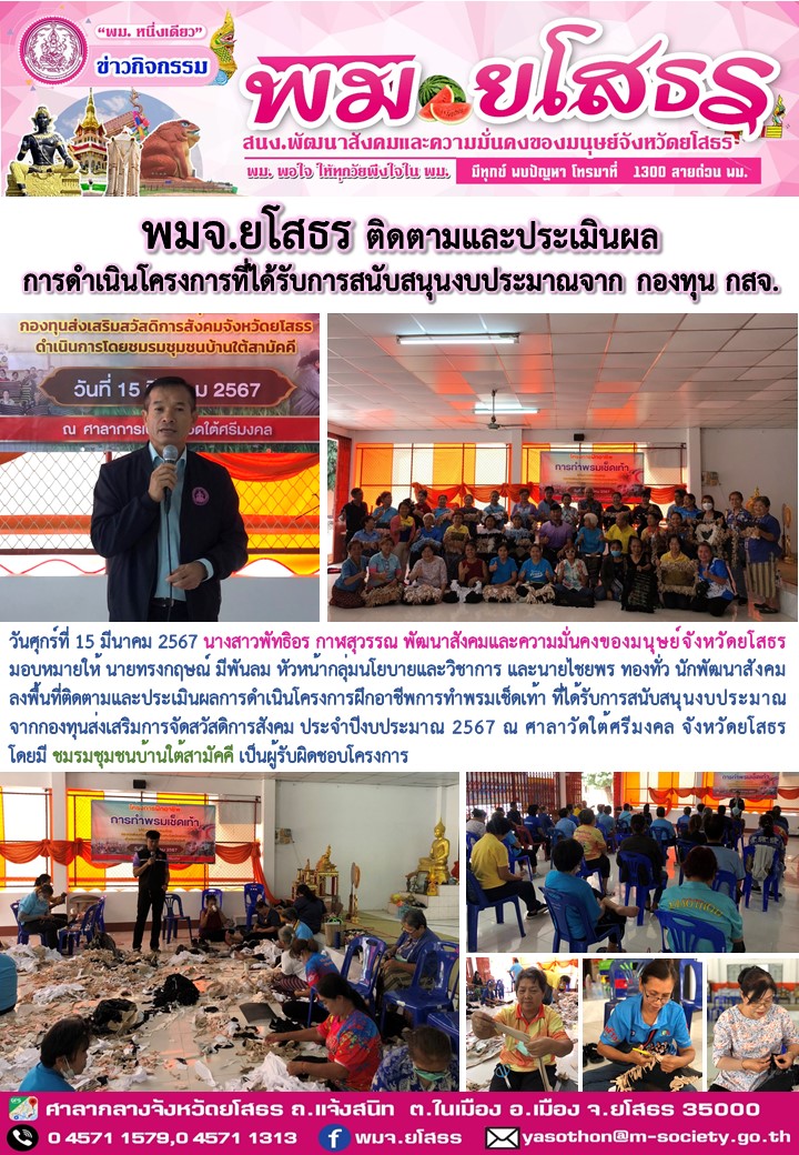 วันที่ 30 เม.ย. 2567 (16:43 น.)วันศุกร์ที่ 15 มีนาคม 2567 นางสาวพัทธิอร กาฬสุวรรณ พัฒนาสังคมและความมั่นคงของมนุษย์จังหวัดยโสธร มอบหมายให้ นายทรงกฤษณ์ มีพันลม หัวหน้ากลุ่มนโยบายและวิชาการ และนายไชยพร ทองทั่ว นักพัฒนาสังคม ลงพื้นที่ติดตามและประเมินผลการดำเนินโครงการฝึกอาชีพการทำพรมเช็ดเท้า ที่ได้รับการสนับสนุนงบประมาณจากกองทุนส่งเสริมการจัดสวัสดิการสังคม ประจำปีงบประมาณ 2567 ณ ศาลาวัดใต้ศรีมงคล จังหวัดยโสธรโดยมี ชมรมชุมชนบ้านใต้สามัคคี เป็นผู้รับผิดชอบโครงการ