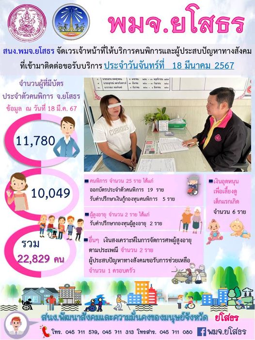 สนง.พมจ.ยโสธร จัดเวรเจ้าหน้าที่ให้บริการคนพิการและผู้ประสบปัญหาทางสังคม ที่เข้ามาติดต่อขอรับบริการ (18 มีนาคม 2567)