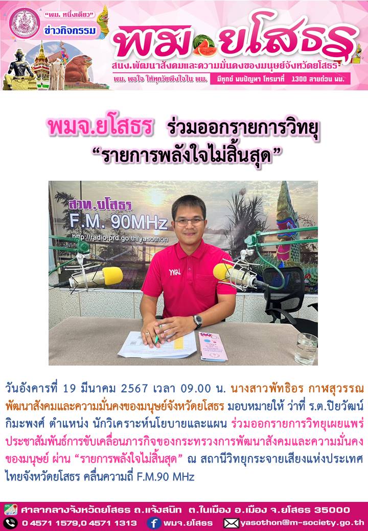 วันที่ 2 พ.ค. 2567 (13:44 น.)วันอังคารที่ 19 มีนาคม 2567 เวลา 09.00 น. นางสาวพัทธิอร กาฬสุวรรณ พัฒนาสังคมและความมั่นคงของมนุษย์จังหวัดยโสธร มอบหมายให้ ว่าที่ ร.ต.ปิยวัฒน์ กิมะพงศ์ ตำแหน่ง นักวิเคราะห์นโยบายและแผน ร่วมออกรายการวิทยุเผยแพร่ประชาสัมพันธ์การขับเคลื่อนภารกิจของกระทรวงการพัฒนาสังคมและความมั่นคงของมนุษย์ ผ่าน “รายการพลังใจไม่สิ้นสุด” ณ สถานีวิทยุกระจายเสียงแห่งประเทศไทยจังหวัดยโสธร คลื่นความถี่ F.M.90 MHz