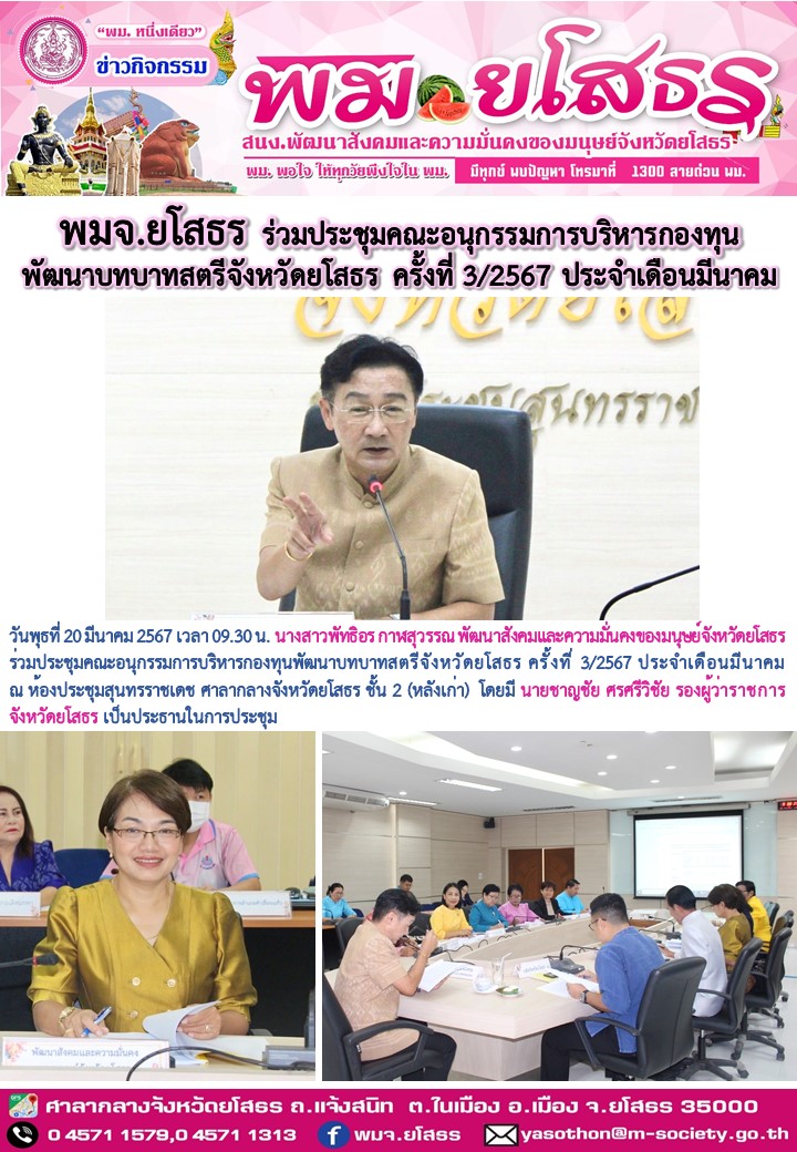 ร่วมประชุมคณะอนุกรรมการบริหารกองทุนพัฒนาบทบาทสตรีจังหวัดยโสธร ครั้งที่ 3/2567 (20 มีนาคม 2567)