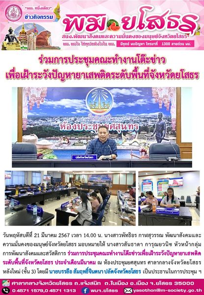พมจ.ยโสธร ร่วมการประชุมคณะทำงานโต๊ะข่าวเพื่อเฝ้าระวังปัญหายาเสพติด ระดับพื้นที่จังหวัดยโสธร (21 มีนาคม 2567)