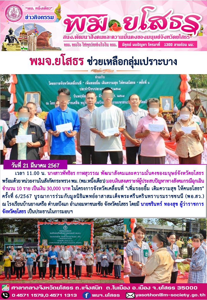 วันที่ 2 พ.ค. 2567 (14:30 น.)วันพฤหัสบดีที่ 21 มีนาคม 2567 เวลา 11.00 น. นางสาวพัทธิอร กาฬสุวรรณ พัฒนาสังคมและความมั่นคงของมนุษย์จังหวัดยโสธร พร้อมด้วย หน่วยงานในสังกัดกระทรวง พม. (พม.หนึ่งเดียว) มอบเงินสงเคราะห์ผู้ประสบปัญหาทางสังคมกรณีฉุกเฉิน จำนวน 10 ราย เป็นเงิน 30,000 บาท ในโครงการจังหวัดเคลื่อนที่ "เพิ่มรอยยิ้ม เติมความสุข ให้คนยโสธร" ครั้งที่ 6/2567 บูรณาการร่วมกับมูลนิธิแพทย์อาสาสมเด็จพระศรีนครินทราบรมราชชนนี (พอ.สว.) ณ โรงเรียนบ้านยางเครือ ตำบลบึงแก อำเภอมหาชนะชัย จังหวัดยโสธร โดยมี นายชรินทร์ ทองสุข ผู้ว่าราชการจังหวัดยโสธร เป็นประธานในการมอบฯ