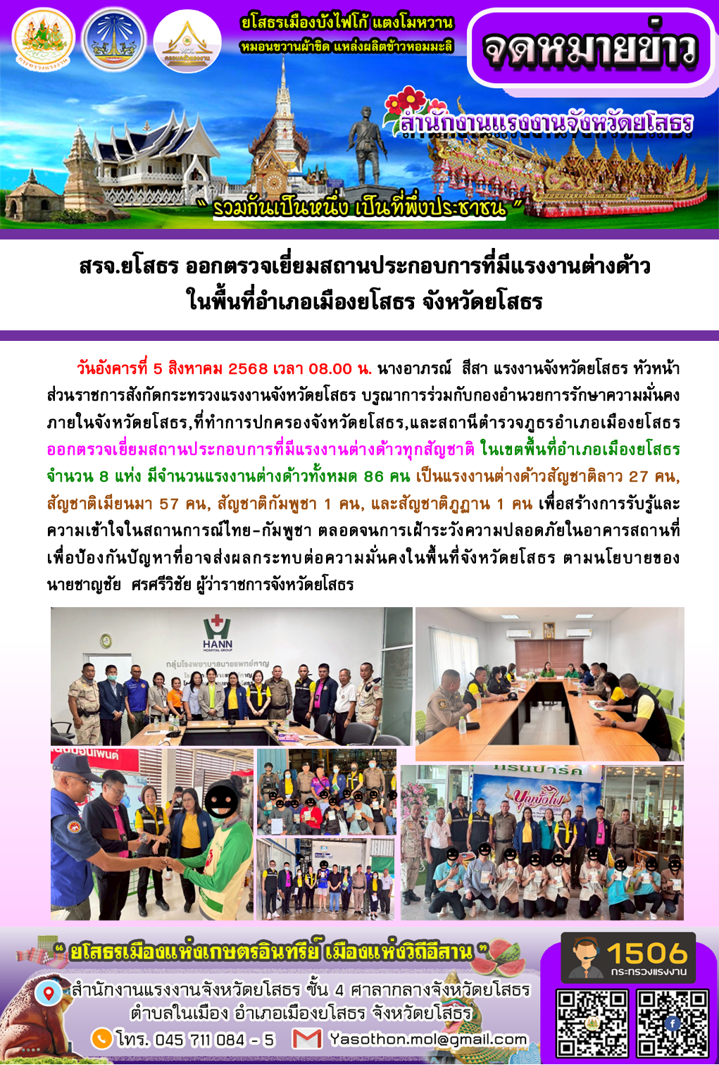 สรจ.ยโสธร ออกตรวจเยี่ยมสถานประกอบการที่มีแรงงานต่างด้าว ในพื้นที่อำเภอเมืองยโสธร จังหวัดยโสธร