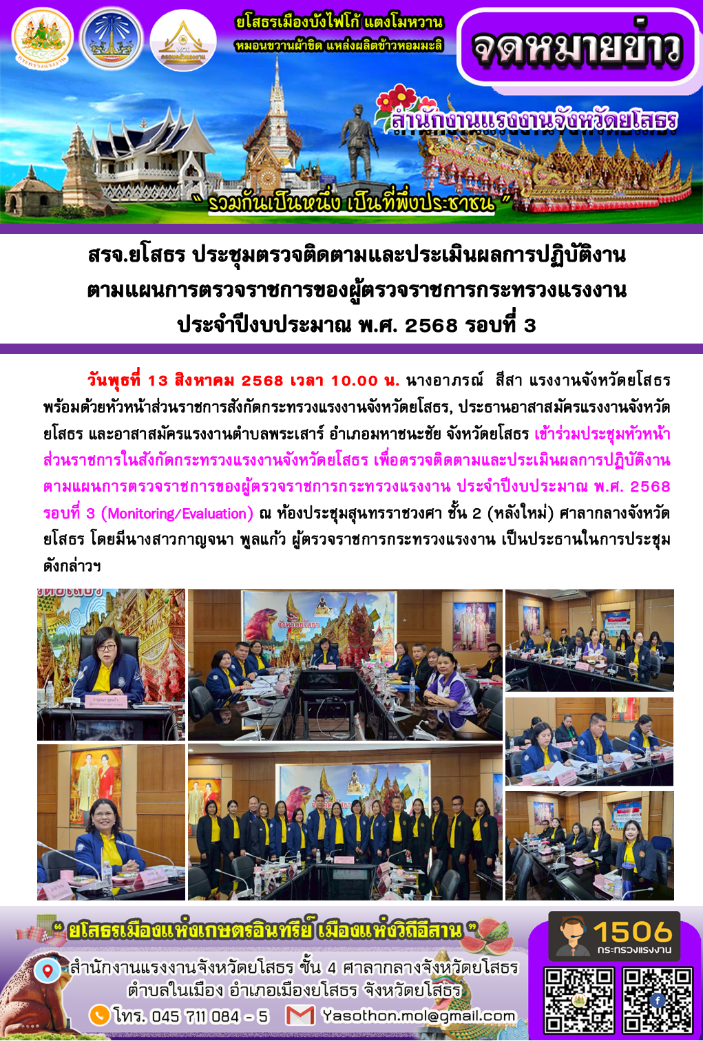 สรจ.ยโสธร ประชุมตรวจติดตามและประเมินผลการปฏิบัติงาน ตามแผนการตรวจราชการของผู้ตรวจราชการกระทรวงแรงงาน ประจำปีงบประมาณ พ.ศ. 2568 รอบที่ 3