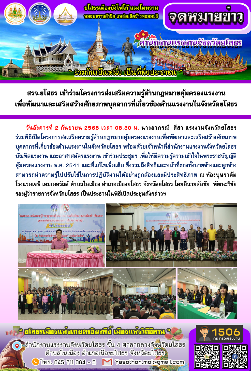 สรจ.ยโสธร เข้าร่วมโครงการส่งเสริมความรู้ด้านกฎหมายคุ้มครองแรงงาน เพื่อพัฒนาและเสริมสร้างศักยภาพบุคลากรที่เกี่ยวข้องด้านแรงงานในจังหวัดยโสธร