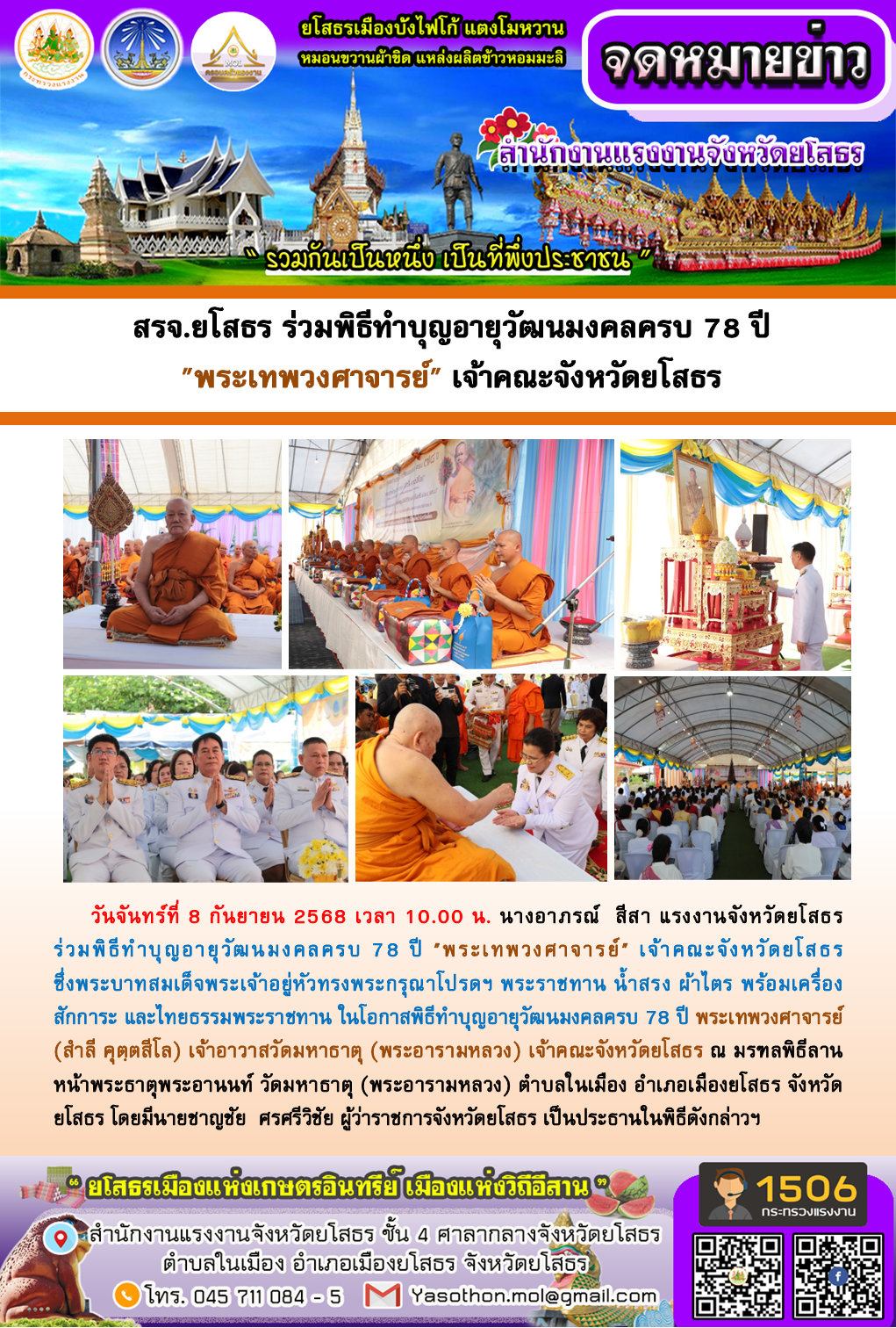 สรจ.ยโสธร ร่วมพิธีทำบุญอายุวัฒนมงคลครบ 78 ปี "พระเทพวงศาจารย์" เจ้าคณะจังหวัดยโสธร