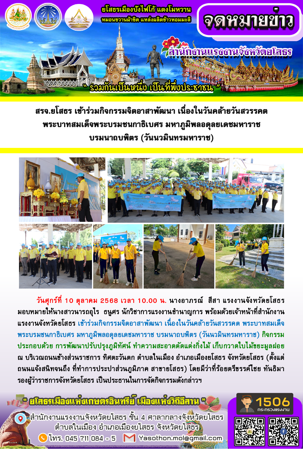 สรจ.ยโสธร เข้าร่วมกิจกรรมจิตอาสาพัฒนา เนื่องในวันคล้ายวันสวรรคต พระบาทสมเด็จพระบรมชนกาธิเบศร มหาภูมิพลอดุลยเดชมหาราช บรมนาถบพิตร (วันนวมินทรมหาราช)