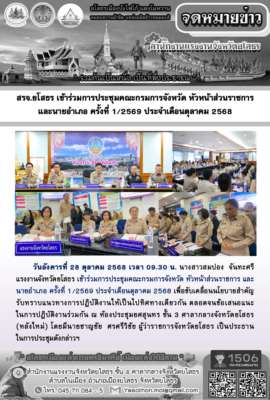สรจ.ยโสธร เข้าร่วมการประชุมคณะกรมการจังหวัด หัวหน้าส่วนราชการ และนายอำเภอ ครั้งที่ 1/2569 ประจำเดือนตุลาคม 2568