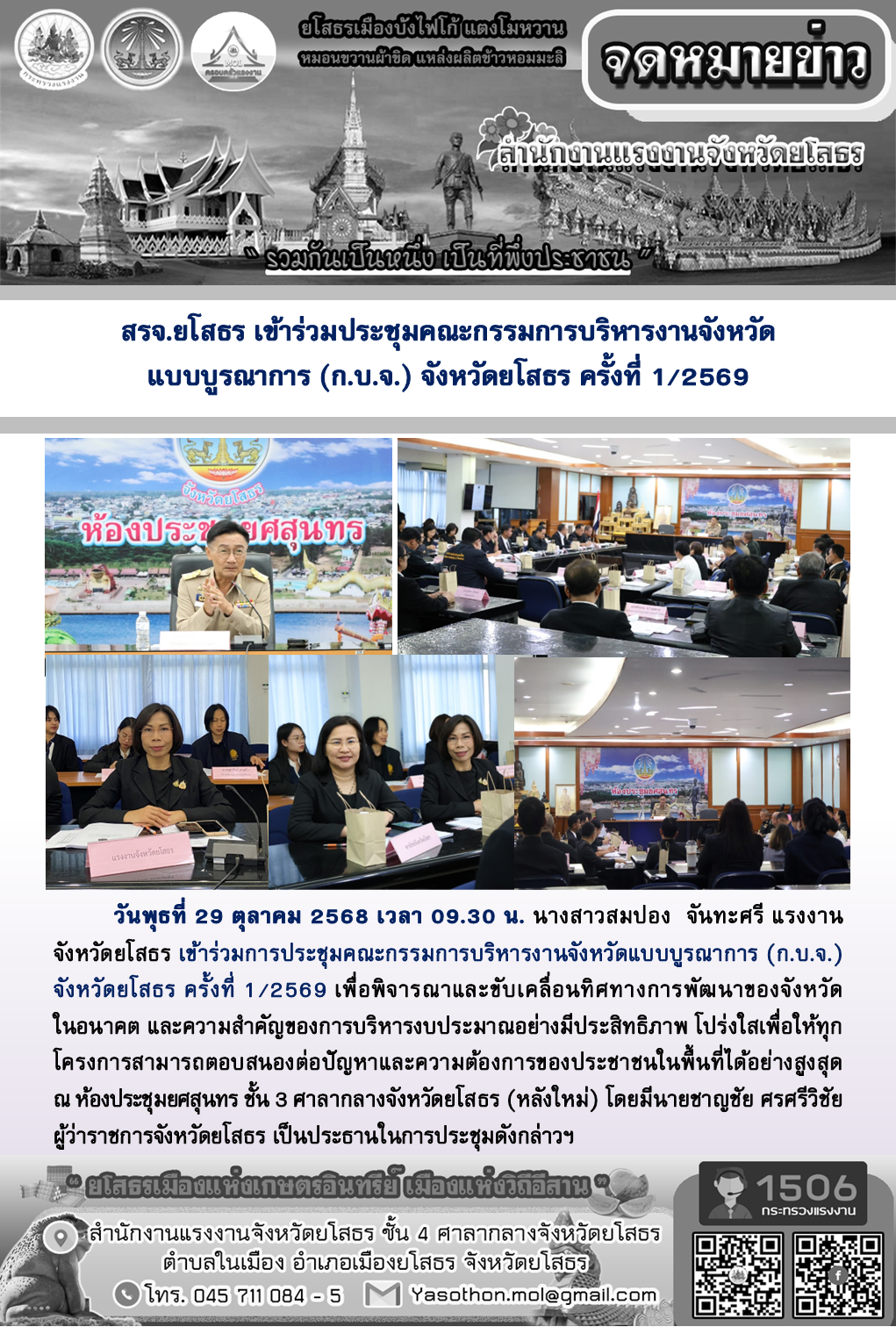 สรจ.ยโสธร เข้าร่วมประชุมคณะกรรมการบริหารงานจังหวัด แบบบูรณาการ (ก.บ.จ.) จังหวัดยโสธร ครั้งที่ 1/2569