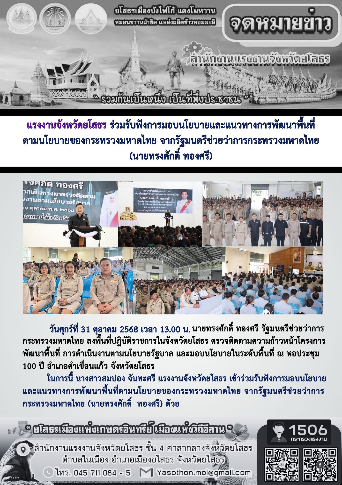 แรงงานจังหวัดยโสธร ร่วมรับฟังการมอบนโยบายและแนวทางการพัฒนาพื้นที่ ตามนโยบายของกระทรวงมหาดไทย จากรัฐมนตรีช่วยว่าการกระทรวงมหาดไทย (นายทรงศักดิ์ ทองศรี)