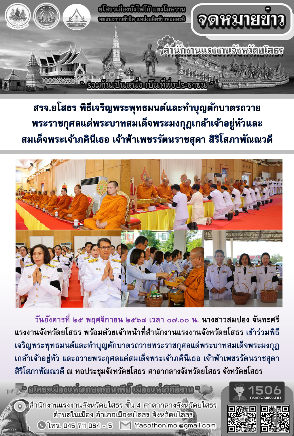 สรจ.ยโสธร พิธีเจริญพระพุทธมนต์และทำบุญตักบาตรถวาย พระราชกุศลแด่พระบาทสมเด็จพระมงกุฎเกล้าเจ้าอยู่หัวและ สมเด็จพระเจ้าภคินีเธอ เจ้าฟ้าเพชรรัตนราชสุดา สิริโสภาพัณณวดี