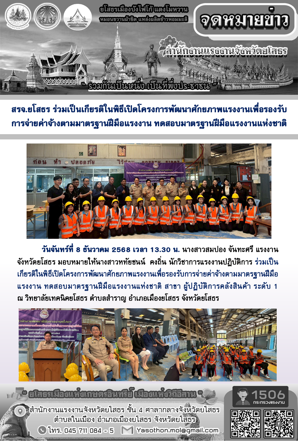 สรจ.ยโสธร ร่วมเป็นเกียรติในพิธีเปิดโครงการพัฒนาศักยภาพแรงงานเพื่อรองรับ การจ่ายค่าจ้างตามมาตรฐานฝีมือแรงงาน ทดสอบมาตรฐานฝีมือแรงงานแห่งชาติ