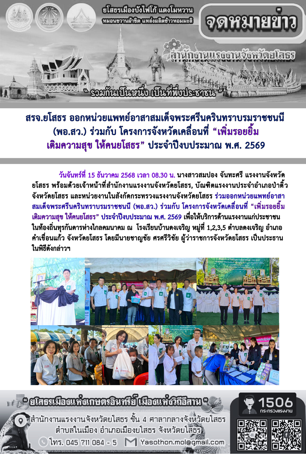 สรจ.ยโสธร ออกหน่วยแพทย์อาสาสมเด็จพระศรีนครินทราบรมราชชนนี (พอ.สว.) ร่วมกับ โครงการจังหวัดเคลื่อนที่ “เพิ่มรอยยิ้ม เติมความสุข ให้คนยโสธร” ประจำปีงบประมาณ พ.ศ. 2569