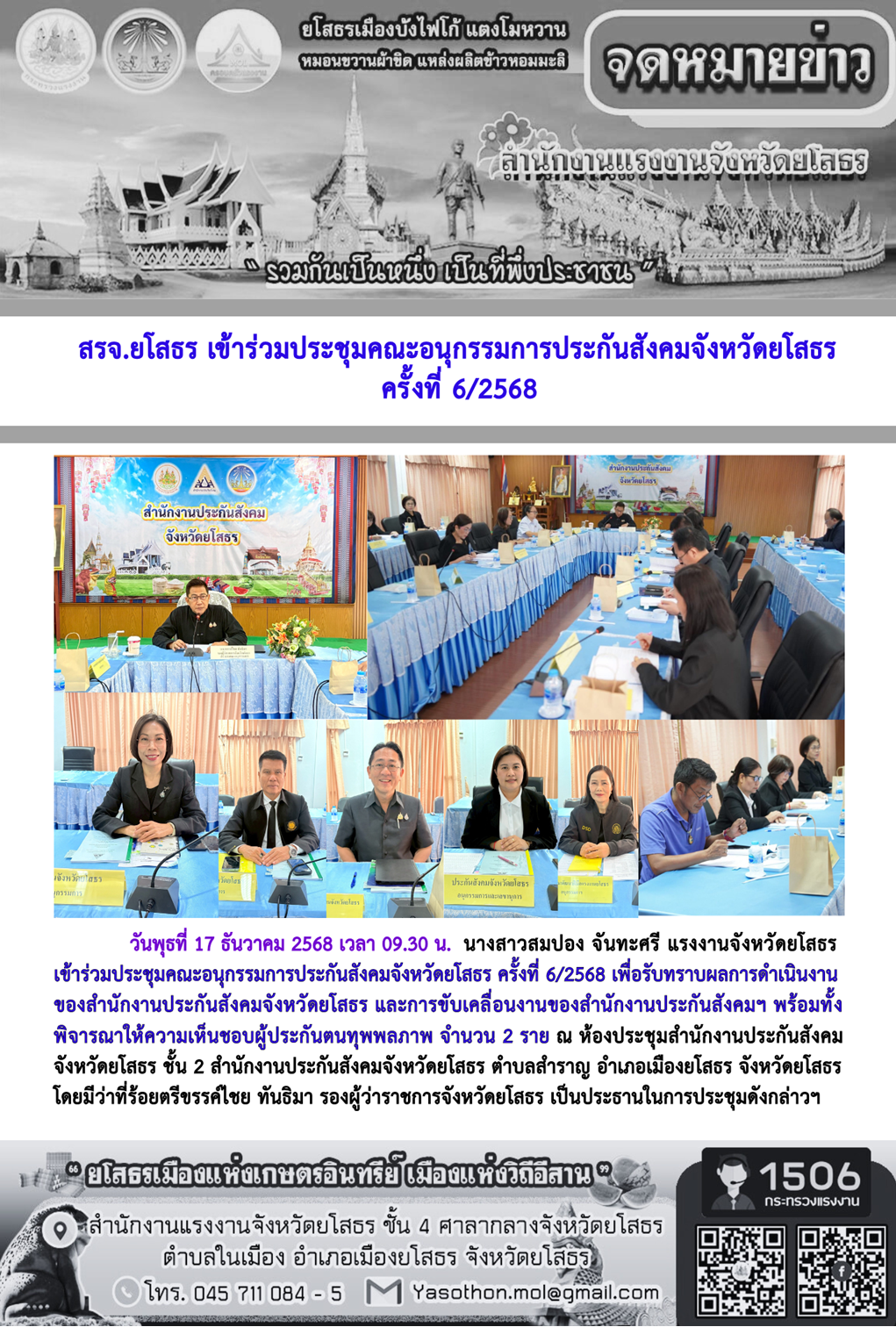 สรจ.ยโสธร เข้าร่วมประชุมคณะอนุกรรมการประกันสังคมจังหวัดยโสธร ครั้งที่ 6/2568