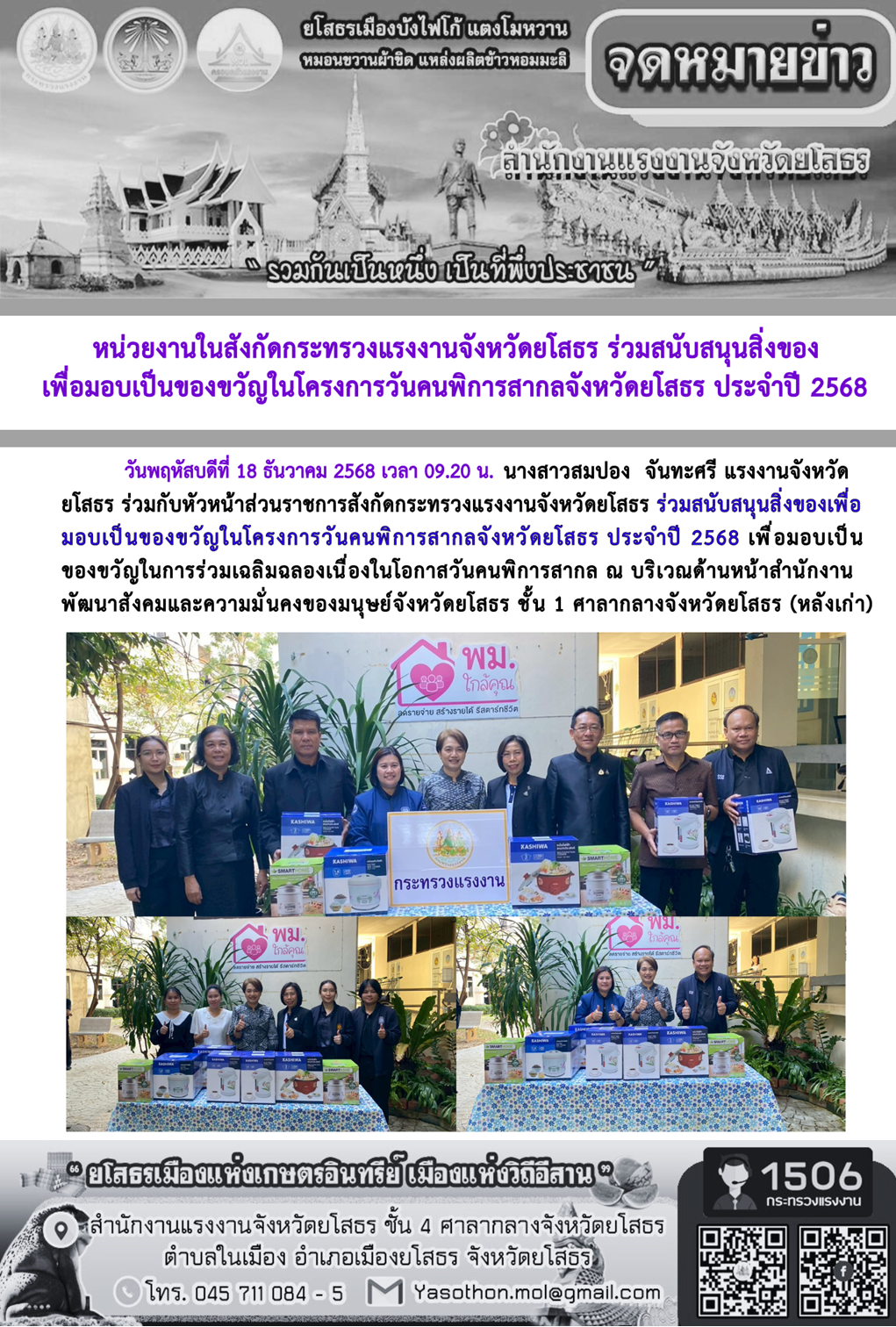 หน่วยงานในสังกัดกระทรวงแรงงานจังหวัดยโสธร ร่วมสนับสนุนสิ่งของ เพื่อมอบเป็นของขวัญในโครงการวันคนพิการสากลจังหวัดยโสธร ประจำปี 2568