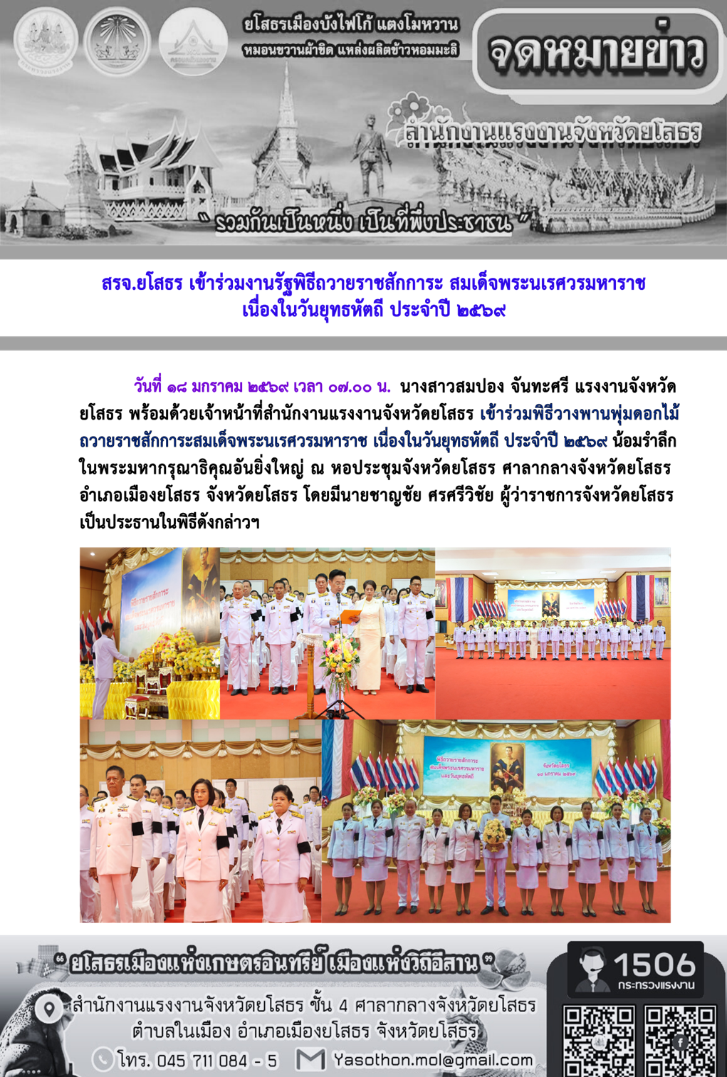 สรจ.ยโสธร เข้าร่วมงานรัฐพิธีถวายราชสักการะ สมเด็จพระนเรศวรมหาราช เนื่องในวันยุทธหัตถี ประจำปี ๒๕๖๙