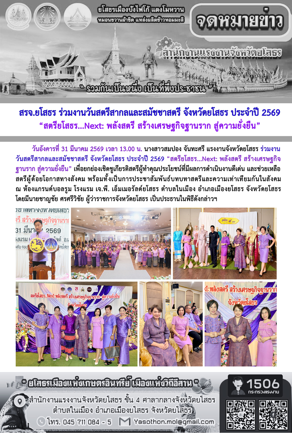 สรจ.ยโสธร ร่วมงานวันสตรีสากลและสมัชชาสตรี จังหวัดยโสธร ประจำปี 2569