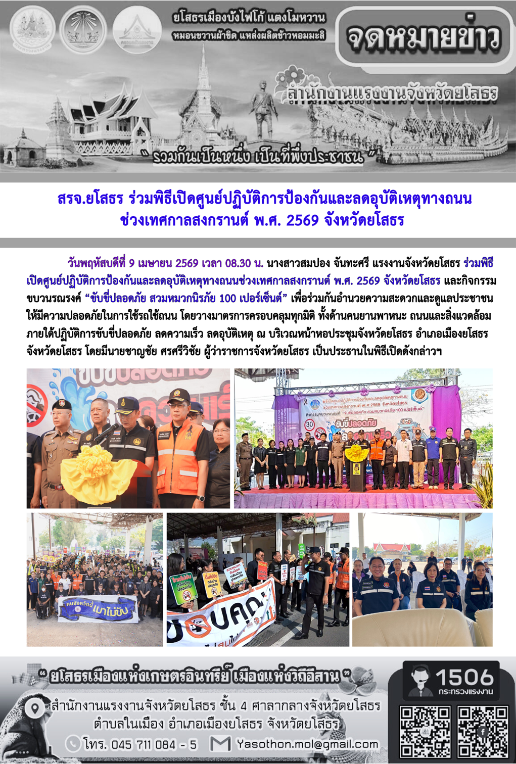 - [10:23] ทั่วไป สสค.ยโสธร ร่วมพิธีเปิดศูนย์ปฏิบัติการป้องกันและลดอุบัติเหตุทางถนนช่วงเทศกาลสงกรานต์ พ.ศ. 2569 จังหวัดยโสธร