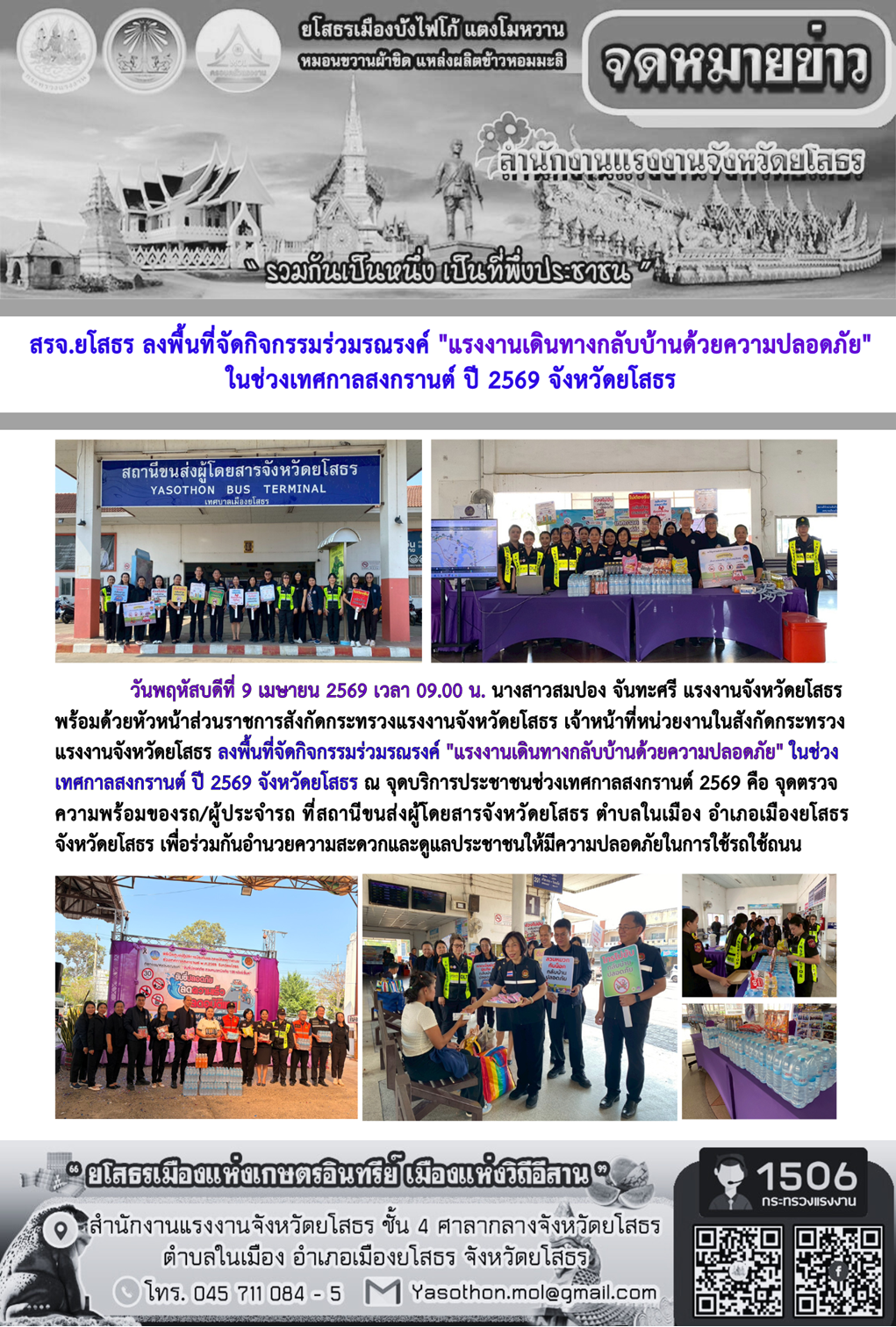 สรจ.ยโสธร ลงพื้นที่จัดกิจกรรมร่วมรณรงค์ "แรงงานเดินทางกลับบ้านด้วยความปลอดภัย" ในช่วงเทศกาลสงกรานต์ ปี 2569 จังหวัดยโสธร