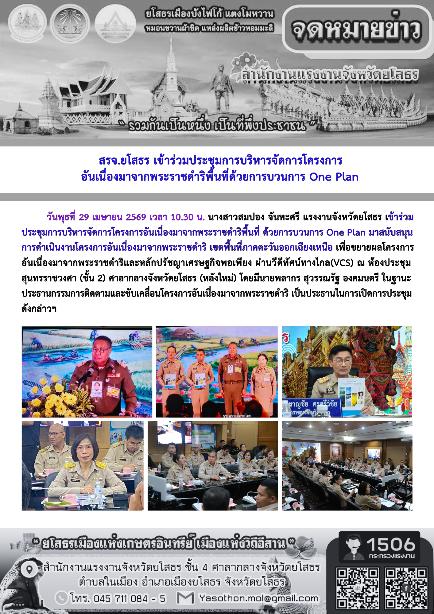 - [15:37] ทั่วไป สรจ.ยโสธร เข้าร่วมประชุมการบริหารจัดการโครงการ อันเนื่องมาจากพระราชดำริพื้นที่ด้วยการบวนการ One Plan