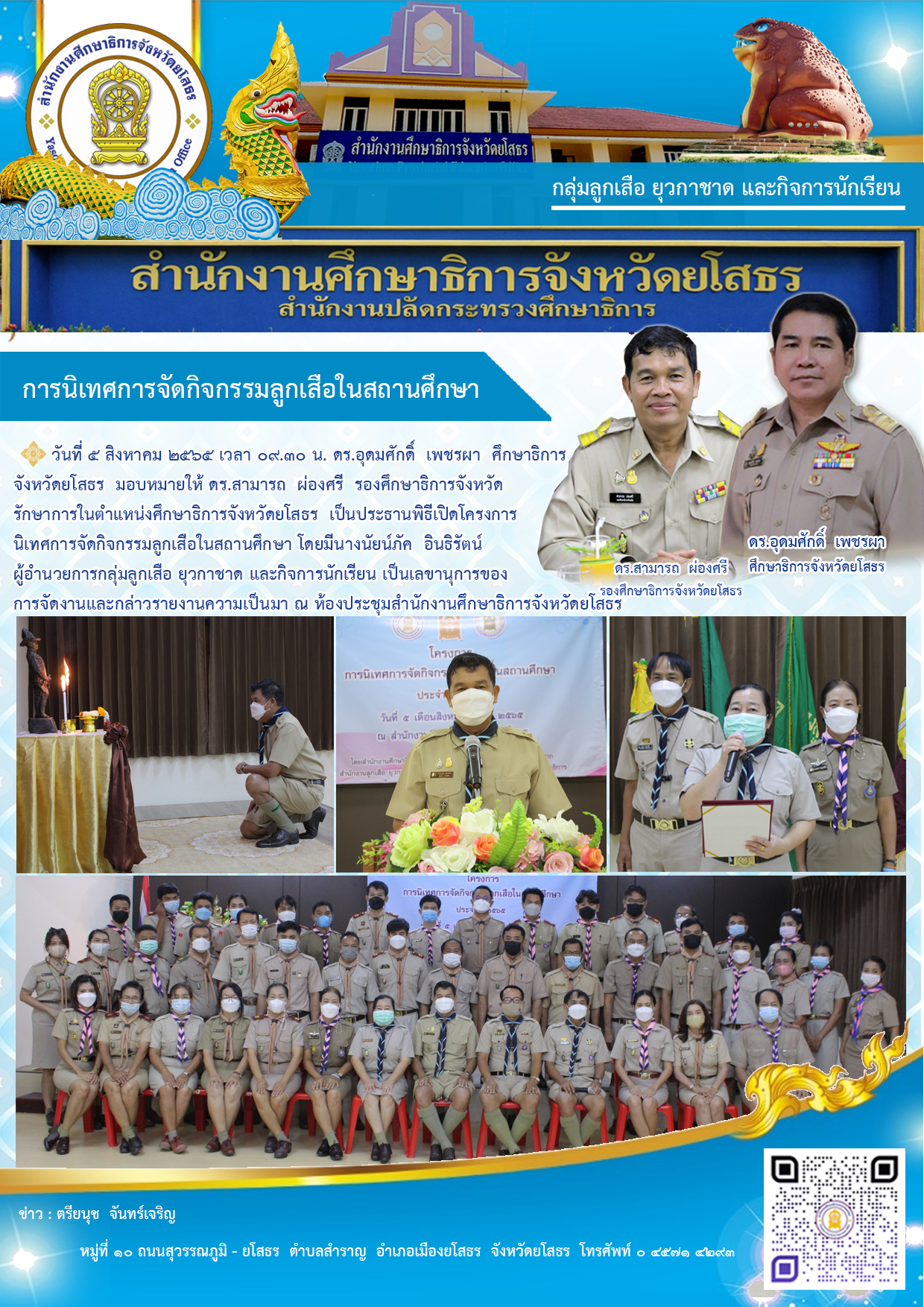 วันที่ 5 ส.ค. 2565 (14:24 น.)วันที่ ๕ สิงหาคม ๒๕๖๕ เวลา ๑๙.๓๐ น. ตร.อุตมศักดิ์ เพชรผา ศึกษาธิการจังหวัดยโสธร มอบหมายให้ ดร.สามารถ ผ่องศรี รองศึกษาธิการจังหวัดยโสธร รักษาการในตำแหน่งศึกษาธิการจังหวัดยโสธร เป็นประธานพิธีเปิดโครงการนิเทศการจัดกิจกรรมลูกเสือในสถานศึกษา โดยมีนางนัยน์ภัค อินธิรัตน์ ผู้อำนวยการกลุ่มลูกเสือ ยวกาชาด และกิจการนักเรียน เป็นเลขานุการของการจัดงานและกล่าวรายงานความเป็นมา ณ ห้องประชุมสำนักงานศึกษาธิการจังหวัดยโสธร.