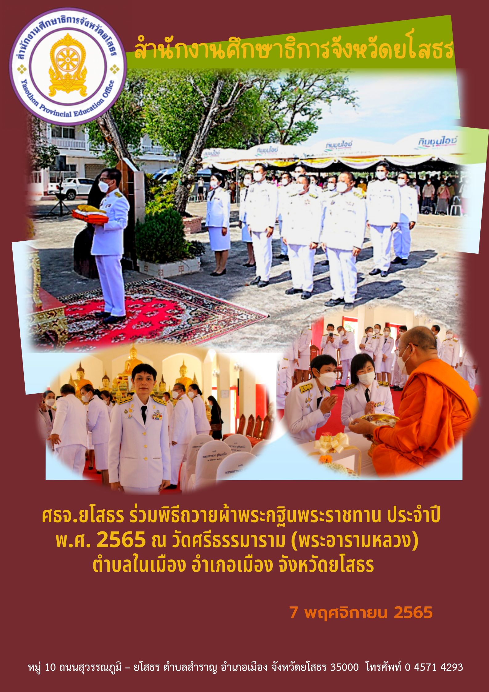 วันที่ 7 พ.ย. 2565 (14:35 น.)ศึกษาธิการจังหวัดยโสธร ร่วมพิธีถวายผ้าพระกฐินพระราชทาน ประจำปี พ.ศ. 2565 ณ วัดศรีธรรมาราม (พระอารามหลวง)