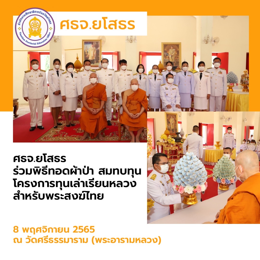 วันที่ 8 พ.ย. 2565 (14:04 น.)วันที่ 8 พฤศจิกายน 2565 สำนักงานศึกษาธิการจังหวัดยโสธร ร่วมพิธีทอดผ้าป่า สมทบทุนโครงการทุนเล่าเรียนหลวงสำหรับพระสงฆ์ไทย ณ วัดศรีธรรมาราม (พระอารามหลวง)