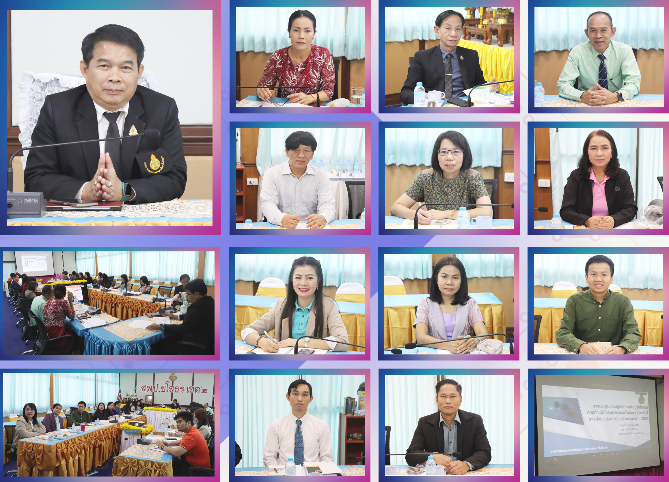วันที่ 25 ตุลาคม 2566 เวลา 08.30 น. นายพิทยา นามบุญลือ ผอ.สพป.ยโสธร เขต 2 พร้อมด้วย นางสุพิชญ์ชญา มีแก้ว นายอาวุธ ทองบุ นายธัญสิริวุฒิ แคนศิลา รอง ผอ.สพป.ยโสธร เขต 2 ผู้อำนวยการกลุ่ม ผู้อำนวยการหน่วย ศึกษานิเทศก์ และบุคลากร สพป.ยโสธร เขต 2 เข้าร่วมประชุมการประชุมเชิงปฏิบัติการเพื่อประเมินผลการดำเนินโครงการของสำนักงานเขตพื้นที่การศึกษา ประจำปีงบประมาณ พ.ศ. 2566 ผ่านระบบออนไลน์ Zoom Meeting ณ ห้องประชุมบุษราคัม สพป.ยโสธร เขต 2