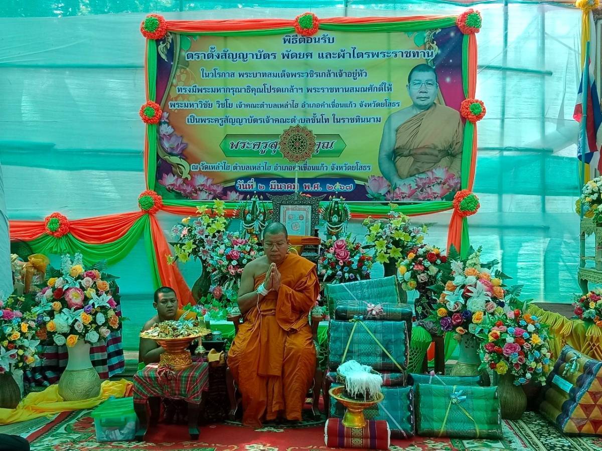 วันที่ 14 มี.ค. 2567 (11:06 น.)วันที่ 1 มีนาคม 2567 เวลา 09.00 น. พ.จ.อ.อนุสิทธิ์ บัวหุ่ง นายอำเภอคำเขื่อนแก้ว เป็นเป็นประธานฝ่ายฆราวาส พิธีต้อนรับสัญญาบัตร พัดยศ และผ้าไตรพระราชทาน พระบาทสมเด็จพระวชิรเกล้าเจ้าอยู่หัว พระราชทานสมณศักดิ์ให้ พระมหาวิชัย วิชโย เจ้าคณะตำบลเหล่าไฮ อำเภอคำเขื่อนแก้ว จังหวัดยโสธร เป็นพระครูสัญญาบัตร เจ้าคณะตำบลชั้นโท ในราชทินนาม พระครูสุตรัตนคุณ ณ วัดเหล่าไฮ ตำบลเหล่าไฮ อำเภอคำเขื่อนแก้ว จังหวัดยโสธร